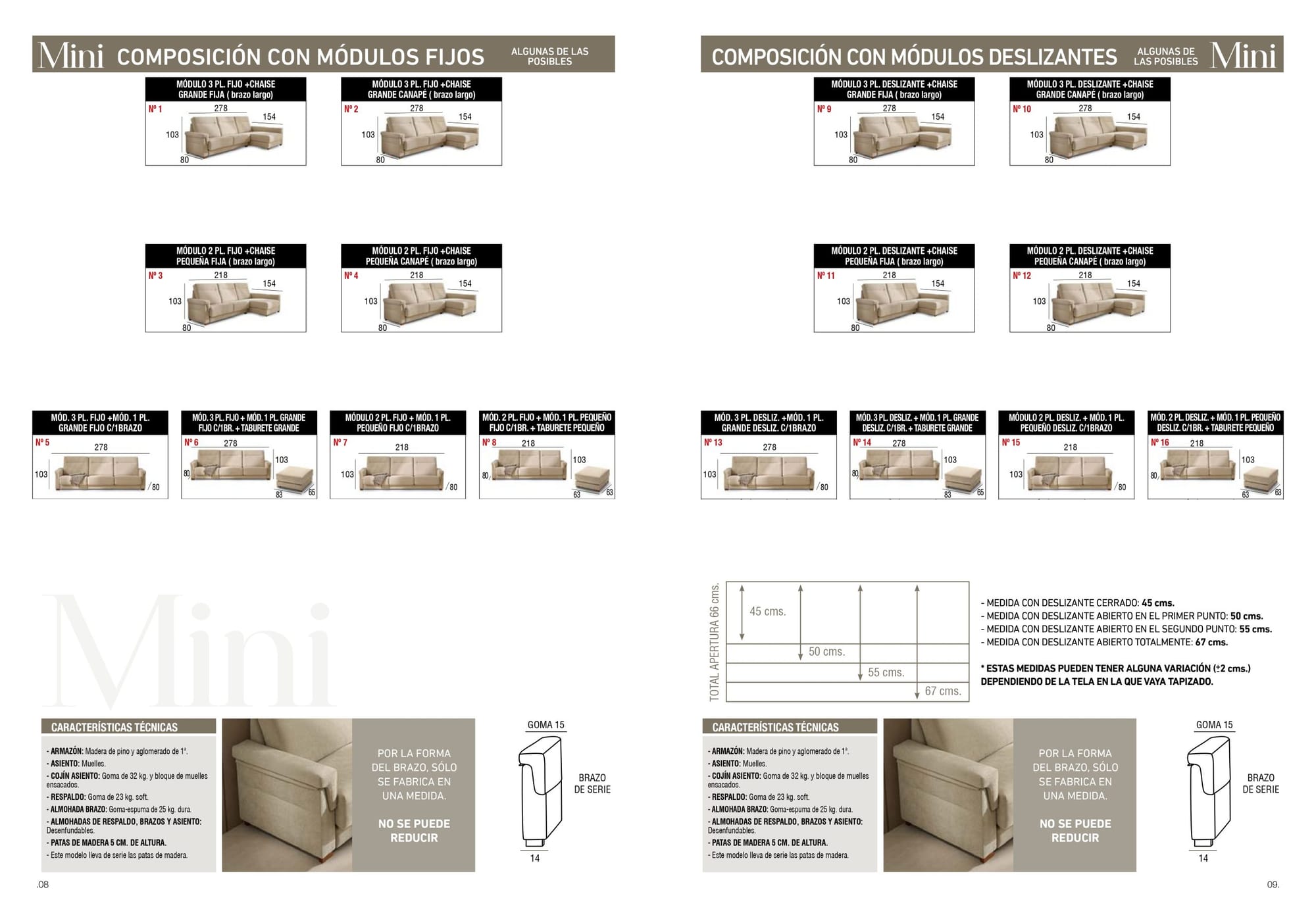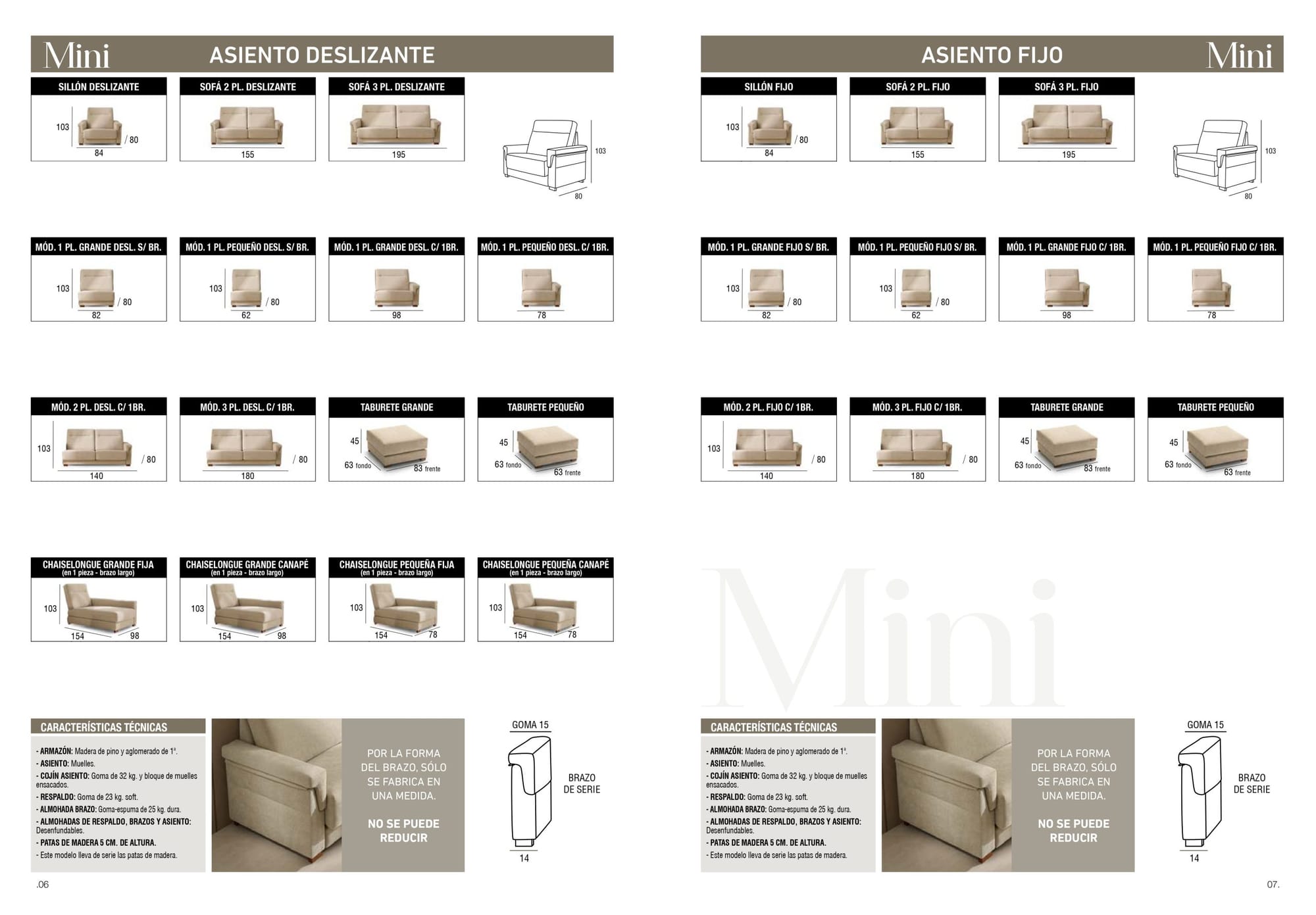 CARACTERÍSTICAS TÉCNICAS – ARMAZÓN: Madera de pino y aglomerado de 1ª. – ASIENTO: Muelles. – COJÍN ASIENTO: Goma de 32 kg. y bloque de muelles ensacados. – RESPALDO: Goma de 23 kg. soft. – ALMOHADA BRAZO: Goma-espuma de 25 kg. dura. – ALMOHADAS DE RESPALDO, BRAZOS Y ASIENTO: Desenfundables. – PATAS DE MADERA 5 CM. DE ALTURA. – Este modelo lleva de serie las patas de madera. Top Tapizados