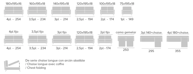 CARACTERÍSTICAS TÉCNICAS: Mecanismo: sistema de apertura italiano, fabricado en tubo de acero, pintado en aleación de aluminio. Somier con malla electrosoldada perimetrada en muelle. Certificado (mecanismo italiano) para mas de 5,000 aperturas. Armazón: Madera de pino y tablero de partículas. Asiento: Gomaespuma de 30 kilos recubierto de fibra de 300g. Respaldo: gomaespuma de 20 kilos súper suave recubierto de fibra de 300 gramos. Patas: madera barnizada de 5 cm. Colchón: Hr 30 kilos 195 cm de largo terminado con tejido strech. Todas las medidas pueden tener una oscilación entre +/- 5 cm. Importante: No cerrar el sofá cama, vestido con sabanas o mantas. OPCIONES: Colchón Premium (Viscogel). Sistema de desplazamiento sofá con ruedas. Francés Bañon