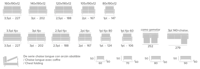 CARACTERÍSTICAS TÉCNICAS: Mecanismo: sistema de apertura italiano, fabricado en tubo de acero, pintado en epoxi. Somier de malla electrosoldada, garantizado para mas de 5,000 aperturas. Certificado (Centro Tecnológico del Mueble y la Madera). Armazón: Madera de pino y tablero de partículas. Asiento: Gomaespuma de 30 kilos recubierto de fibra de 300g. Respaldo: fibra acrílica siliconada. Patas: Negra de 5 cm. Colchón. Hr 30 kilos 190 cm de largo x 12 cm de grosor. Todas las medidas pueden tener una oscilación entre +/- 5 cm. De serie colchón de 12 cm. El uso de colchón diferente al de 12 cm, penaliza la sentada que queda más recta y firme. Importante: No cerrar el sofá cama, vestido con sabanas o mantas. OPCIONES: Colchón de 12 cm de grosor con Visco. Colchón de 15 cm de grosor. Colchón de 15 cm de grosor con Visco. Colchón de 18 cm de grosor. Colchón de 18 cm de grosor con Visco. Brazo terminal de 2 cm. Francés Bañon