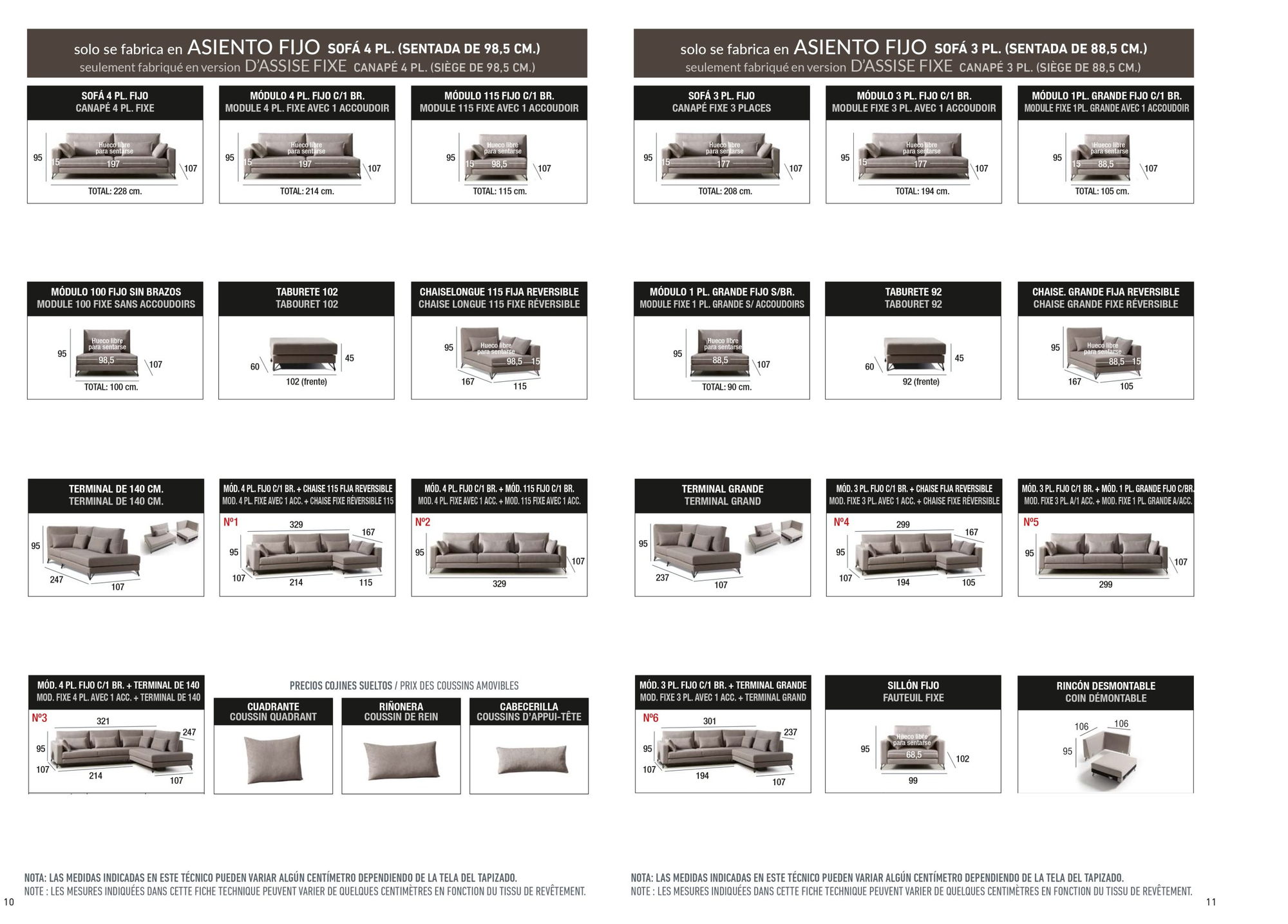 Armazón madera de pino y D.M. 1,8 Asiento base muelles. Cojín asiento goma 32Kg. con muelles ensacados. Respaldo fibra hueca garantizada. Almohadas de respaldo, asiento y rinconeras, cuadrantes y cabecera: desenfundables. Top Tapizados